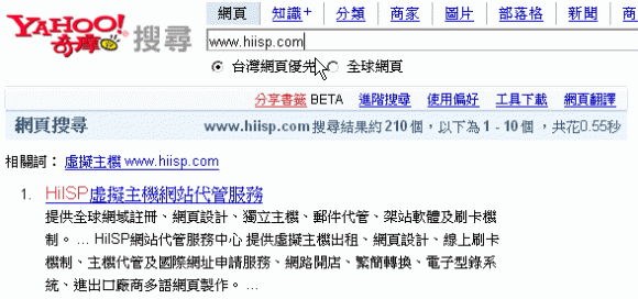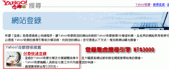 一次性收費,即可快速十天內讓 (古狗 Google/ 雅虎 Yahoo/ Msn / 蕃薯籐 Yam / Pchome 網路家庭 / Hinet 中華電信) 以上搜尋引擎收錄您的網站。