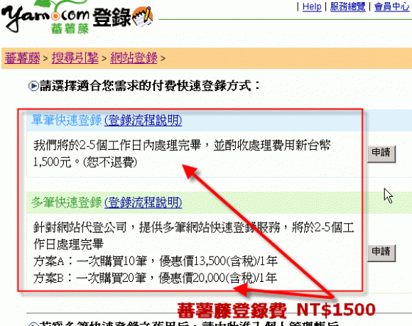 一次性收費NT$ 3800 元,即可透過我們的登錄技術,提供快速十天內,讓以下搜尋引擎的網頁搜尋中就可以找的到您的網站。包含基礎型關鍵字串 (3組) 曝光導入的服務,古狗 Google/ 雅虎 Yahoo/ Msn / 蕃薯籐 Yam / Pchome 網路家庭 / Hinet 中華電信。您只需付費登錄一次,就可以讓這嘛多的搜尋引擎的網頁資料庫中找到貴公司的網站,包含其他中國地區的搜尋引擎也會陸續會於 30 天內陸續的收錄您的網址。