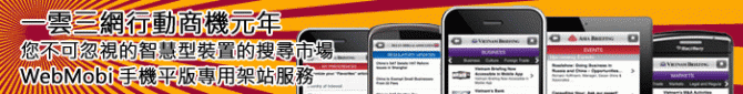 臺灣網域協助企業搶得行動商務商機,推出「WebMobi雲端行動架站服務」:整合智慧架站軟體系統,讓企業主可快速建置手機版網站,擴展接觸行動上網客戶的行銷業務。透過快速簡單的操作介面,企業可以無須花高額開發費用與硬體成本,也無須高深電腦技術即可透過 WebMobi手機平板架站服務,建立適合觸控介面的行動版網站。配合多種風格版型,快速打造企業行動網站,擴展行動商務。